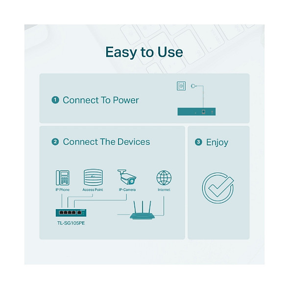 TL-SG105PE is easy to use and manage. Auto MDI/MDI-X crossover on all ports eliminate the need for crossover cables or uplink ports. Auto-negotiation on each port senses the link speed of a network device (either 10, 100, or 1000 Mbps) and intelligently adjusts for compatibility and optimal performance. Its compact size makes it ideal for desktops with limited space. Dynamic LED lights provide real-time work status display and basic fault diagnosis."