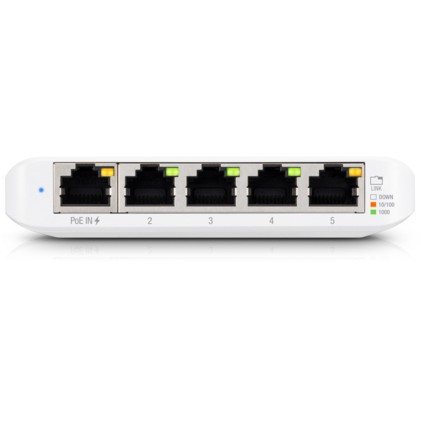 Build and expand your network with the UniFi® Switch, part of the Ubiquiti Networks® UniFi Enterprise System. The UniFi Switch, model USW-Flex-Mini, is a smart managed Gigabit switch. It offers 5 RJ45 Ethernet ports, providing 1 Gigabit links to your devices. Power up the USW-Flex-Mini with the included USB Type-C power adapter or with 802.3af PoE Ethernet in port 1."