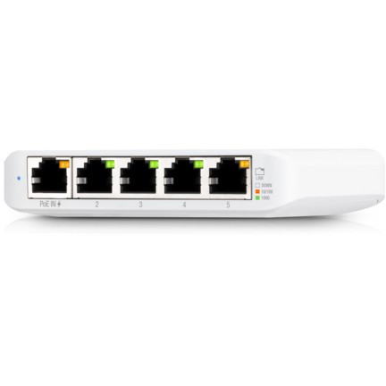 "Ubiquiti UniFi USW Flex Mini. Switch type: Managed, Switch layer: L2. Basic switching RJ-45 Ethernet ports type: Gigabit Ethernet (10/100/1000), Basic switching RJ-45 Ethernet ports quantity: 5. Switching capacity: 10 Gbit/s. Networking standards: IEEE 802.3af, IEEE 802.3at. Power over Ethernet (PoE)"\n"5-Port managed Gigabit Ethernet switch powered by 802.3af/at PoE or 5V, 1A USB-C power adapter