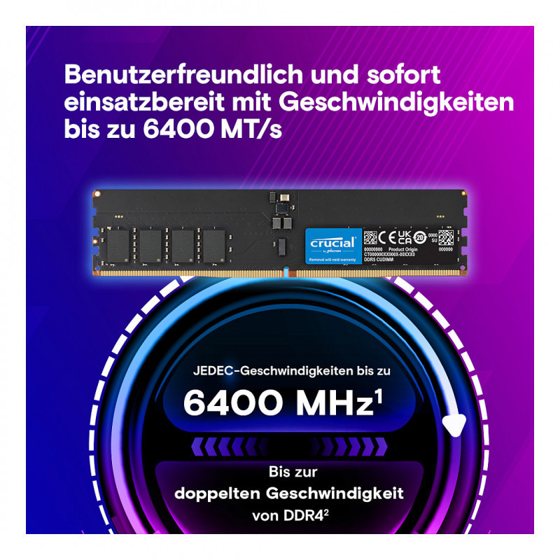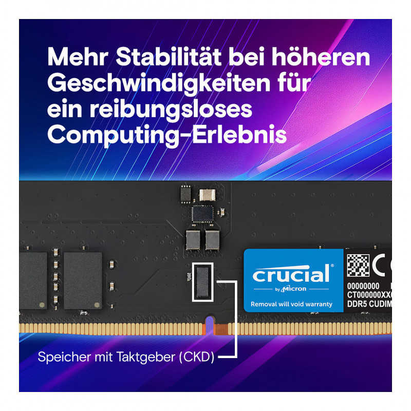 "Crucial CT2K32G64C52CU5. Component for: PC, Internal memory: 64 GB, Memory layout (modules x size): 2 x 32 GB, Internal memory type: DDR5, Memory form factor: 288-pin DIMM, CAS latency: 52, Product colour: Black"\n"Crucial CUDIMM and CSODIMM