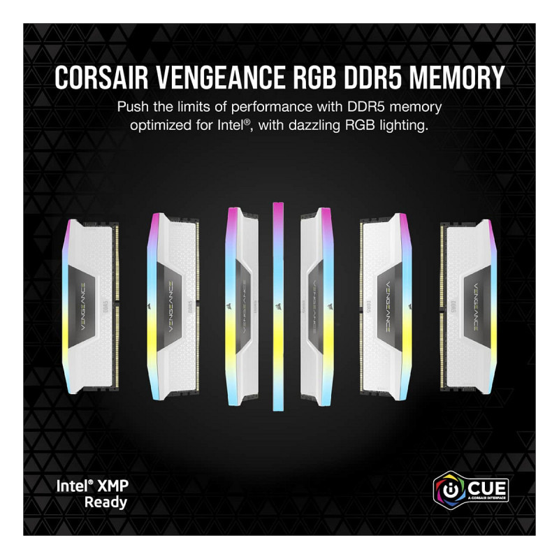 "Corsair Vengeance RGB . Component for: PC, Internal memory: 64 GB, Memory layout (modules x size): 2 x 32 GB, Internal memory type: DDR5, Memory clock speed: 5200 MHz, Memory form factor: 288-pin DIMM, CAS latency: 40"\n"VENGEANCE RGB DDR5 DRAM