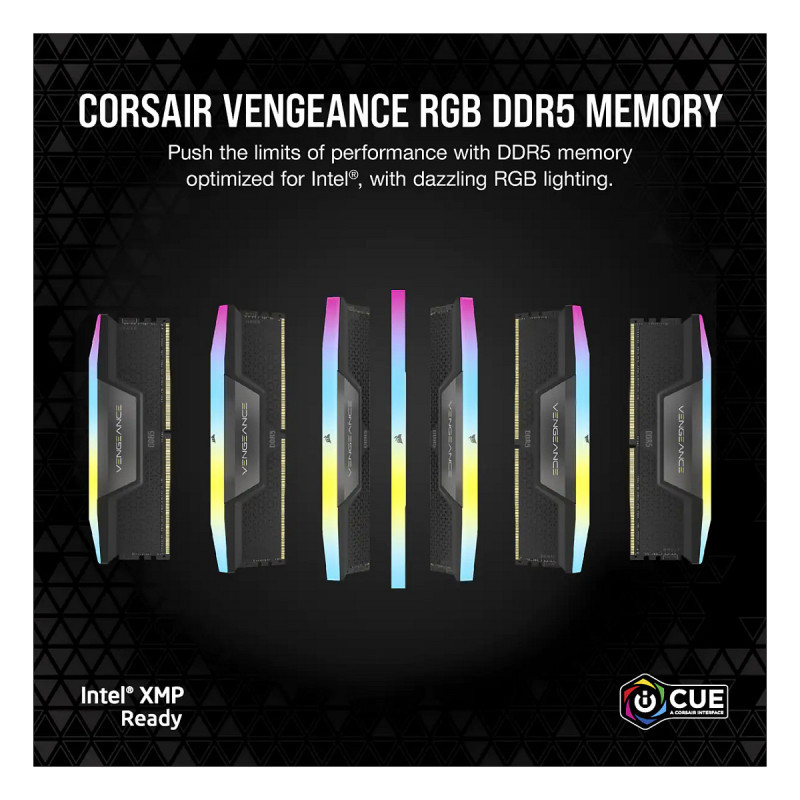 "Corsair Vengeance RGB CMH64GX5M2B6000Z40. Component for: PC, Internal memory: 64 GB, Memory layout (modules x size): 2 x 32 GB, Internal memory type: DDR5, Memory clock speed: 6000 MHz, Memory form factor: 288-pin DIMM, CAS latency: 40, Product colour: Black"\n"VENGEANCE RGB DDR5 DRAM