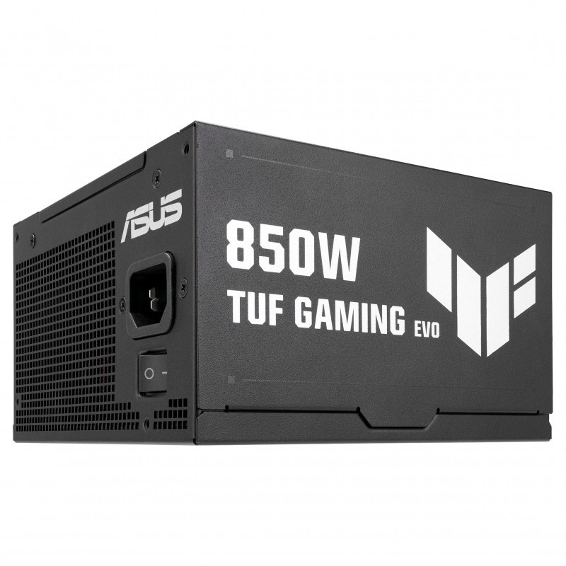 "ASUS TUF-GAMING-850G-EVO. Total power: 850 W, AC input voltage: 100 - 240 V, Power Factor Correction (PFC) type: Active. Motherboard power connector: 20+4 pin ATX, Motherboard power cable length: 50 cm, SATA power cable length: 400,120 mm. Purpose: PC, Power supply unit (PSU) form factor: ATX, 80 PLUS certification: 80 PLUS Gold. Product colour: Black, Cooling type: Active, Number of fans: 1 fan(s). Cables included: CPU, PCIe, Peripheral (Molex), SATA"\n"TUF Gaming Gold EVO Series