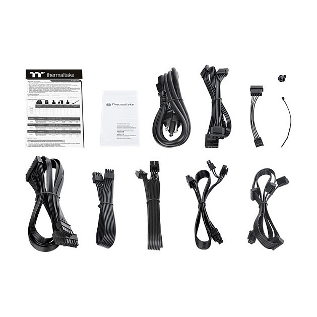 "Thermaltake Toughpower GF2 ARGB 850W - TT Premium Edition. AC input voltage: 100 - 240 V, AC input frequency: 50 - 60 Hz, Input current: 10 A. Motherboard power connector: 24-pin ATX, Motherboard power cable length: 60 cm, SATA power cable length: 150,500 mm. Bearing technology: HDB, Mean time between failures (MTBF): 100000 h. Product colour: Black, Cooling type: Active, Fan diameter: 14 cm. Cables included: AC, CPU, Peripheral (Molex), SATA"\n