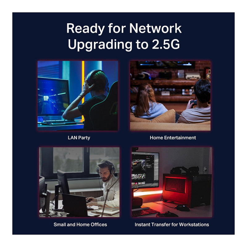 As the flagship 2.5G products, the 5/8-Port desktop switches with 5/8× 2.5-Gigabit ports unlock the highest performance of your Multi-Gig bandwidth and devices, and provide up to 25/40 Gbps of switching capacity. Auto-negotiation 3-speed (100Mb/1G/2.5G) connections sense the link speeds and intelligently adjust for compatibility and optimal performance for all your devices, including 2.5G NAS, 2.5G PCIe adapter, gaming console, VR gaming, 2.5G WiFi 6 AP, 4K video, desktop, and more.