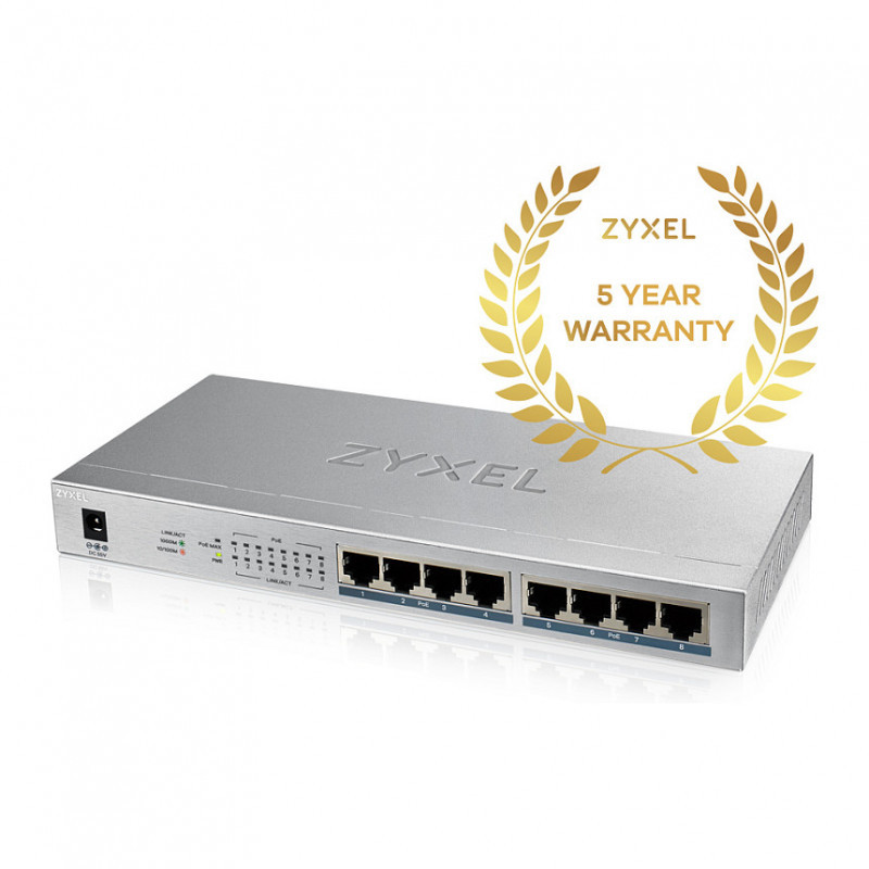The Zyxel GS1008HP is equipped with 8 gigabit Ethernet ports, all of which are PoE ports that can deliver up to 60W of total PoE budget. The GS1008HP can easily connect with PoE ready devices to your network with plug-and-play design while providing power-saving benefits without compromising performance. The GS1008HP fills a long-standing hole in the market for unmanaged PoE switches that feature the 802.3at standard, has a high power budget and are affordable for SOHOs and small businesses.