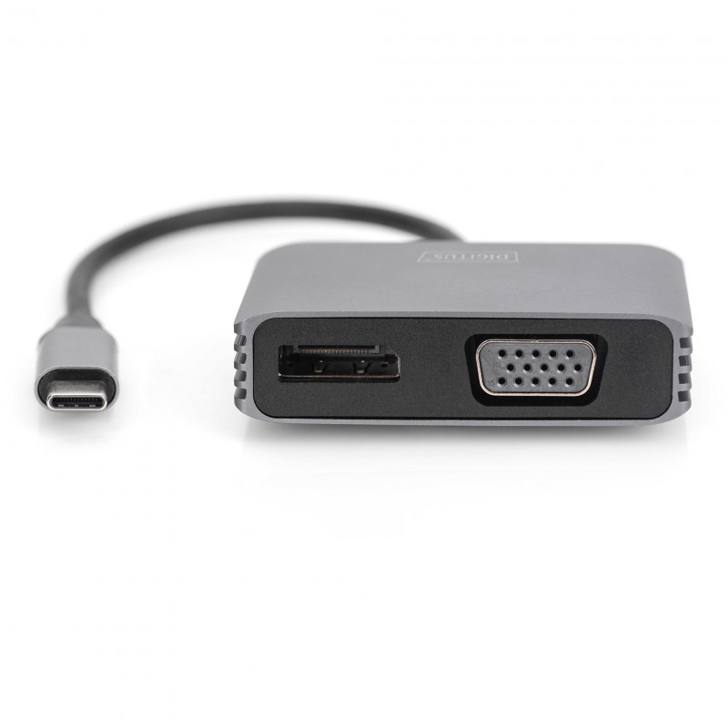 "Digitus USB Type-C™ 4K 2-in-1 DisplayPort + VGA Graphics Adapter. Maximum resolution: 4096 x 2160 pixels. Product colour: Black. Windows operating systems supported: Windows 8.1, Mac operating systems supported: Mac OS X 11.0 Big Sur, Other operating systems supported: Android. Width: 62 mm, Depth: 200 mm, Height: 15.2 mm. Package width: 20 mm, Package depth: 150 mm, Package height: 80 mm"\n"Transmits video and audio signals from a USB-C™ port to a DisplayPort or VGA interface in resolutions of up to 4K Ultra HD