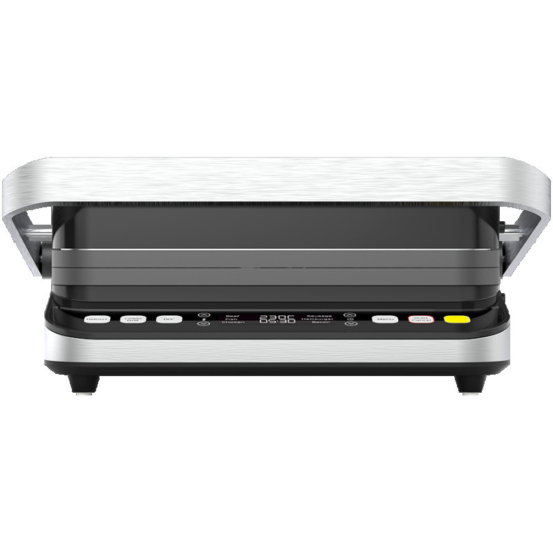 Defrost Function e-Recipe Book 3-in-1: Grill, Barbecue and Oven Powerfull - 2000W Precise Manual settings: up to 230 °C in 5 °C increments; up to 60 minutes timer Enlarged coking space: 6 portions at the same time Cook at 2 plates at the same time: 180° opening angle Double-sided plates: choose the preferable ones - ribbed or flat Convinient LED display Intuitive touch control Auto power-off: overheat protection Cook healthy food with no oil: non-stick plates 5 minutes for ideal medium-rare steak Anti-slip feet keeps grill firmly in place Color and sound indication Oil Drip tray: less mess while cooking Removable non-stick plates: easy-to-clean under the tap or in dishwasher Fast pre-heating: ready to use in 2 minutes Safe-to-touch: non-heated handle and top surface Included: 2 double sided plates, oil drip tray Compatible accessories always available: waffle plates, double-sided plates 320*220mm plate size 6 preset cooking programs: Beef, Fish, Chicken, Sausage, Hamburger, Bacon 2 cooking modes: lower grill or both grills Easy-to-clean control panel |