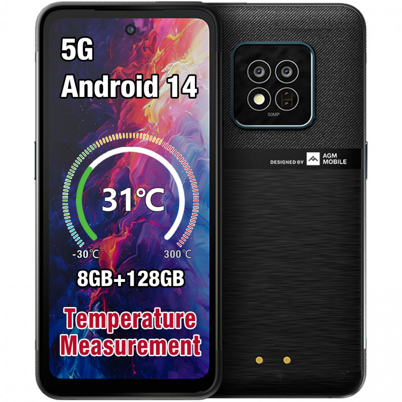 "AGM X6 Phantom. Display diagonal: 17.2 cm (6.78""), Display resolution: 2460 x 1080 pixels. Processor family: Unisoc, Processor model: T750. RAM capacity: 8 GB, Internal storage capacity: 128 GB. Rear camera resolution (numeric): 50 MP. SIM card capability: Dual SIM. Operating system installed: Android 14. Battery capacity: 5000 mAh. Product colour: Transparent"\n"Multi-scene Temperature Detection (Human body temperature and object temperature detection, object temperature range from -30 to 300 degrees Celsius.”)