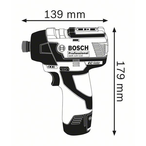 "Bosch 0 601 9E0 005. Product type: Impact wrench, Product colour: Black, Blue. Drive size: 1/4"", Idle speed (max): 3100 RPM, Torque (max): 110 N⋅m. Power source: Battery, Battery technology: Lithium-Ion (Li-Ion), Battery capacity: 2.5 Ah. Width: 54 mm, Depth: 139 mm, Height: 177 mm. Screw diameter: M10, M12, M4, M6, M8"\n