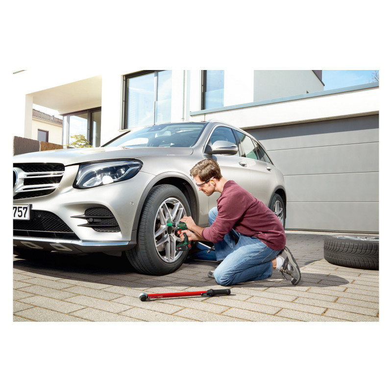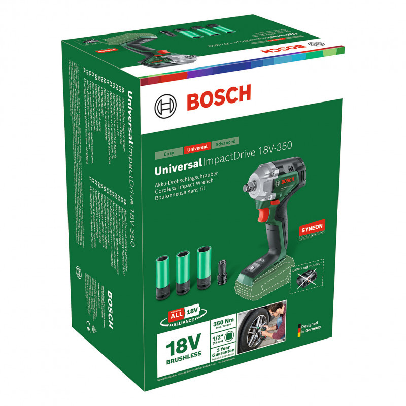 "Bosch UniversalImpactDrive 18V-350 (Bare tool + Hex Adapter + 3 Nuts 17, 19, 21mm). Product type: Impact driver, Handle shape: Pistol handle, Chuck diameter: 1/2"". Idle speed (1st gear): 1200 RPM, Idle speed (2nd gear): 1700 RPM, Idle speed (3rd gear): 2300 RPM. Power source: Battery. Width: 65 mm, Depth: 136 mm, Height: 212 mm"\n"When changing wheels, the Bosch UniversalImpactDrive 18V-350 makes life easier. This cordless impact wrench has 3 speed/torque settings, delivers max. 350 Nm torque and max. 3400 impacts per minute. That makes it powerful and versatile when it comes to tackling stubborn wheel nuts, removing old or rusty bolts or driving large screws into wood with ease. With a 1/2"" external square head, this impact wrench can be fitted with a range of compatible attachments, making it practical for a variety of tasks. Brushless motor technology ensures greater power and longer tool life. Thanks to its compact design, this impact wrench is easy to carry and perfect for overhead work. The built-in Bosch Syneon Electronic protects your tool and battery. The tool belongs to the 18V POWER FOR ALL system. One battery can be used in all 18V POWER FOR ALL tools."