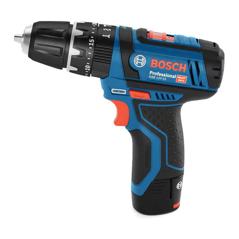 "Bosch GSB 12V-15 Professional. Product design: Pistol grip drill. Chuck capacity (max): 1 cm, Idle speed (max): 1300 RPM, Drilling diameter in wood (max): 1.9 cm. Power source: Battery, Battery voltage: 12 V. Width: 187 mm, Height: 178 mm, Package width: 245 mm. Number of batteries included: 2 pc(s), Number of drill bits: 25 pc(s)"\n