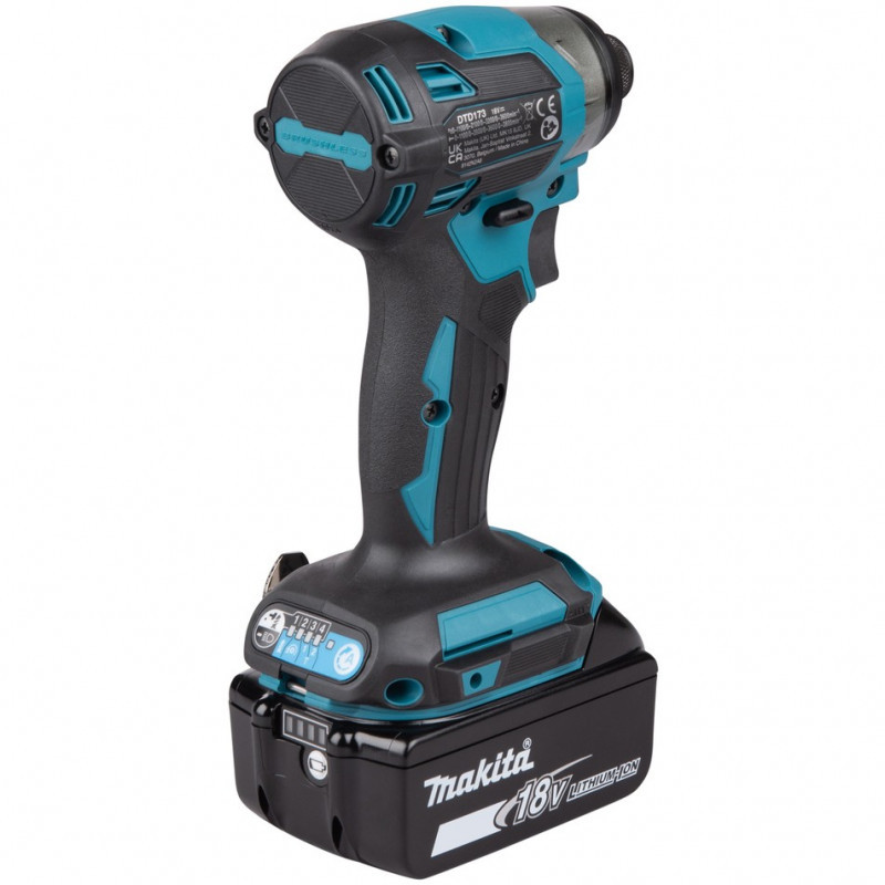 "Makita DTD173RTJ. Product type: Impact driver, Handle shape: Pistol handle, Chuck diameter: 1/4"". Idle speed (max): 3600 RPM, Idle speed (min): 1100 RPM, Torque (min): 20 N⋅m. Power source: Battery, Battery voltage: 18 V, Battery technology: Lithium-Ion (Li-Ion). Width: 81 mm, Depth: 111 mm, Height: 234 mm"\n