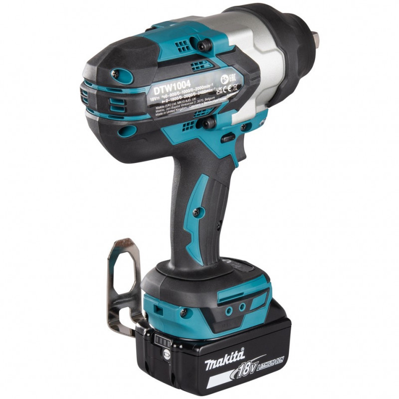 "Makita DTW1004Z. Product type: Impact wrench, Motor type: Brushless, Product colour: Black, Turquoise. Drive size: 1/2"", Idle speed (max): 2200 RPM, Torque (max): 1050 N⋅m. Power source: Battery, Battery technology: Lithium-Ion (Li-Ion), Battery voltage: 18 V. Width: 99 mm, Depth: 261 mm, Height: 254 mm"\n