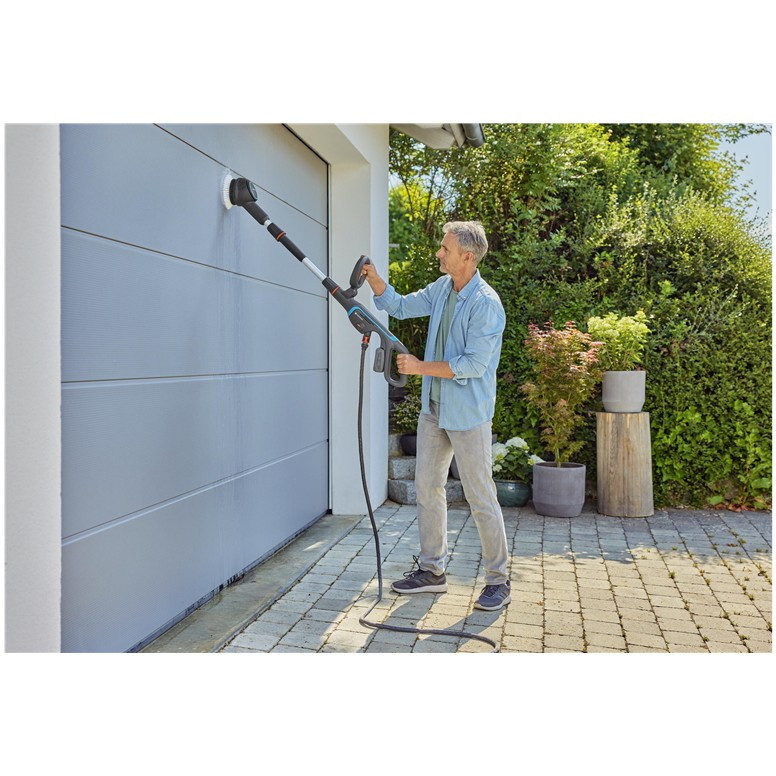 Introducing our Battery Multi Cleaner AquaBrush Universal, with an optimised brush profile for versatile outdoor cleaning. With a barrel brush for wood, WPU and stone, and a disc brush for surfaces such as garage doors and fences, this cleaner easily adapts to your needs. Switch attachments for horizontal or vertical surfaces, from gentle to intensive cleaning, to reach those hard-to-reach areas. Your ultimate solution for universal outdoor cleaning.