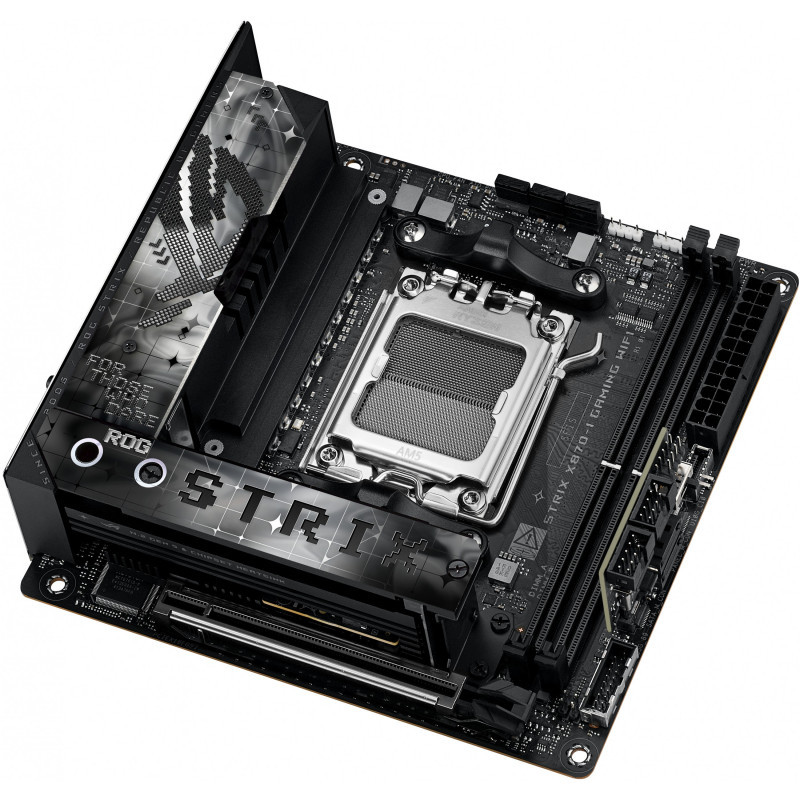 "ASUS ROG STRIX X870-I GAMING WIFI. Processor manufacturer: AMD, Processor socket: Socket AM5, Compatible processor series: AMD Ryzen 7000 Series, AMD Ryzen 8000 Series, AMD Ryzen 9000 Series. Supported memory types: DDR5-SDRAM, Maximum internal memory: 96 GB, Memory slots type: DIMM. Supported storage drive interfaces: M.2, SATA III, Supported storage drive types: HDD & SSD, RAID levels: 0, 1, 10. USB connector type: USB Type-A, USB Type-C. Ethernet interface type: 2.5 Gigabit Ethernet, Fast Ethernet, Gigabit Ethernet, Top Wi-Fi standard: Wi-Fi 7 (802.11be), Wi-Fi standards: Wi-Fi 7 (802.11be)"\n"ROG STRIX X870-I gaming wifi