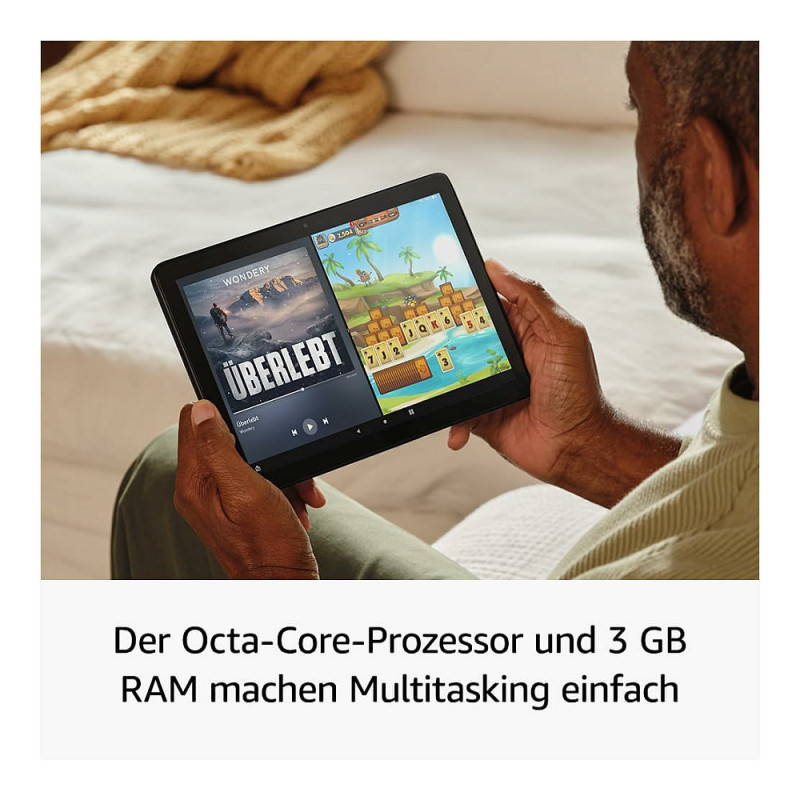 "Amazon Fire B0CXL5RV2F. Display diagonal: 25.6 cm (10.1""), Display resolution: 1920 x 1200 pixels. Internal storage capacity: 32 GB. Processor frequency: 2.05 GHz, Processor family: ARM, Processor model: Cortex-A55. Internal memory: 4 GB. Rear camera resolution (numeric): 5 MP, Rear camera type: Single camera, Front camera resolution (numeric): 5 MP, Front camera. Top Wi-Fi standard: Wi-Fi 6 (802.11ax). Weight: 433 g. Product colour: Black"\n"DO WHAT YOU LOVE, UNINTERRUPTED: 25% faster performance than the previous generation and 3 GB RAM are ideal for seamless streaming, reading and gaming.