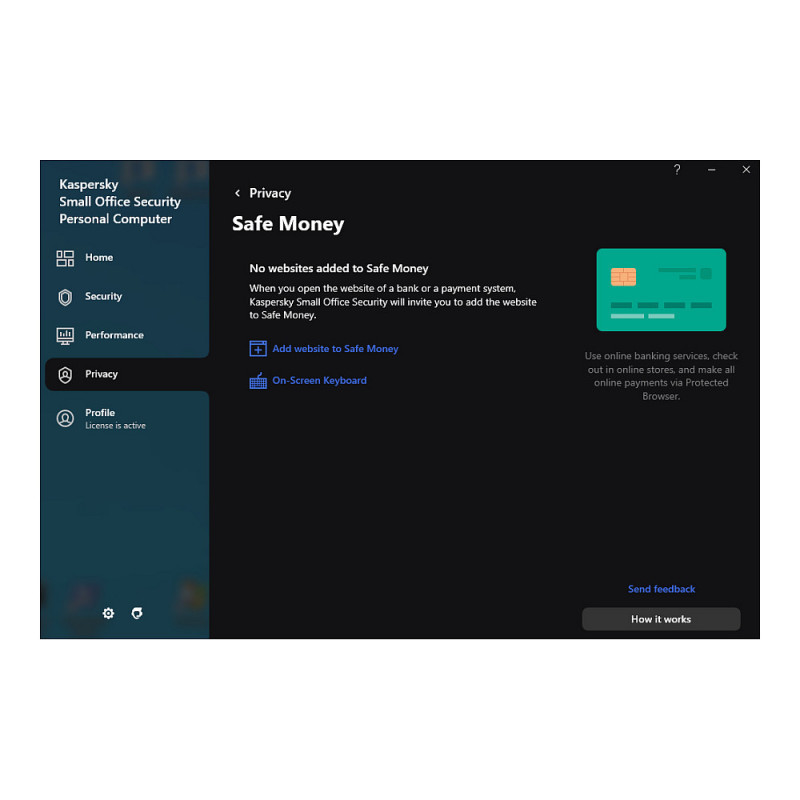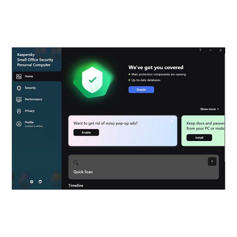 "Kaspersky Small Office Security. License quantity: 1 license(s), License term in years: 2 year(s), License type: Base. Minimum storage drive space: 1500 MB, Minimum RAM: 1024 MB. Software type: License. Distribution type: Download"\n"Get security done