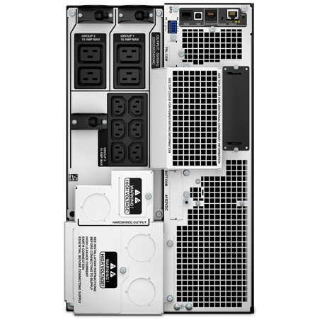 "APC Smart-UPS On-Line, 8kVA/8kW, Tower, 230V 3:1 and 1:1, 6x C13+4x C19 IEC outlets, Network Card+SmartSlot, Extended runtime, W/O rail kit. UPS topology: Double-conversion (Online), Output power capacity: 8 kVA, Output power: 8000 W. AC outlet types: C13 coupler, C19 coupler, Power plug: Hardwire, AC outlets quantity: 10 AC outlet(s). Battery technology: Sealed Lead Acid (VRLA), Battery capacity: 1728 VAh, Battery life (max): 5 year(s). Form factor: Rackmount/Tower, Product colour: Black, Display type: LCD. Compliance certificates: RoHS, Certification: REACH, CE, CE Mark, EAC, EN/IEC 62040-1, EN/IEC 62040-2, IRAM, RCM, VDE"\n"This APC Smart-UPS is designed for IT professionals or network administrators to maintain business uptime and continuity. This 8kVA on-line tower UPS provides pure sine wave power and extended runtime to support critical electronics during power disruptions. It comes with hard wire 3-wire(1P+N+E)/5-wire(3P+N+E) input, 6x IEC 320 C13, 4x IEC 320 C19 outlets, and 3x IEC jumper cables. The UPS has an embedded Network Management Card for UPS network-based monitoring and management. The UPS comes with PowerChute Network Shutdown that provides graceful shutdown of physical servers, virtual machines, and HCI clusters. It has an additional SmartSlot for optional accessory card such as Dry Contact I/O card. The UPS can connect to EcoStruxure IT or third-party centralized management platforms. The UPS has a 3-year warranty, and the built-in lead-acid battery has a 2-year warranty. The UPS is compatible with SRTRK2 (4-post) and SRTRK3 (2-post) rail kits sold separately."