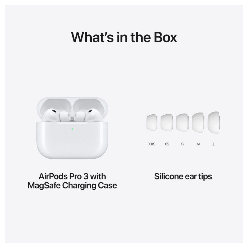 Apple AirPods Pro 3 – belaidės „true wireless“ ausinės (in‑ear, baltos) – tai naujos kartos premium ausinės, sukurtos tiems, kurie nori aukštos kokybės garso, pažangios aktyvios triukšmo slopinimo (ANC), ilgesnės baterijos ir papildomų išmaniųjų funkcijų. Jos yra integruotos į Apple ekosistemą, todėl itin gerai veikia su iPhone, iPad, Mac ir kitais Apple įrenginiais.