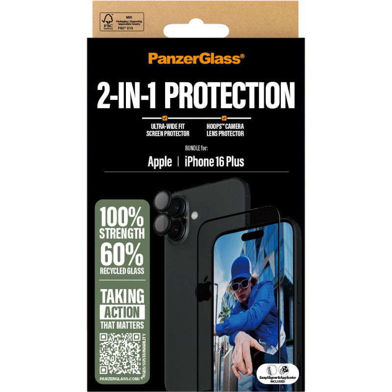 "PanzerGlass ® 2-in-1 Bundle iPhone 16 Plus. Brand compatibility: Apple, Compatibility: Apple - iPhone 16 Plus. Dry application. Protection features: Scratch resistant, Shock resistant. Material: Tempered glass, Polyethylene terephthalate (PET), Silicone, Product colour: Transparent. Quantity per pack: 1 pc(s)"\n"Want to protect your phone? I mean REALLY protect your phone? Then this 2-in-1 protection pack from PanzerGlass® is for you! Featuring an Ultra-Wide Fit Screen Protector, and a Hoops® Camera Lens Protector, this pack shields your phone from scratch-creating bumps against sharp-edged corners, phone-cracking falls onto stone-hard pavements and just about anything else life might throw at you. The screen protector even has a smudge-free coating that reduces traces of fingerprints and grease.