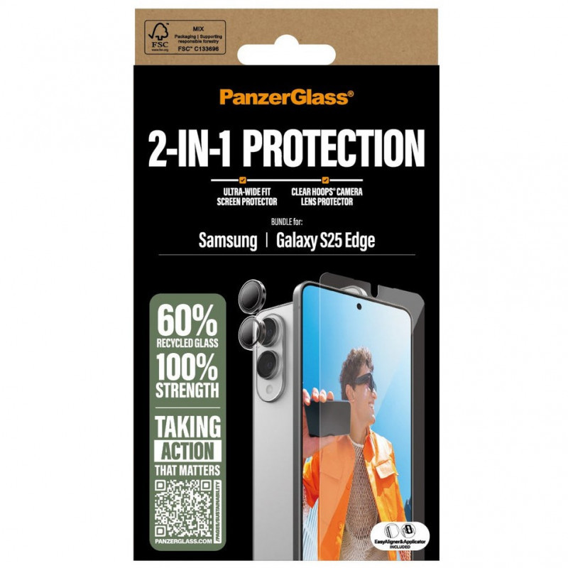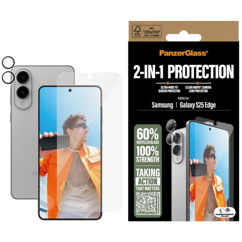 "PanzerGlass PG34438. Brand compatibility: Samsung, Compatibility: S25 Edge, Protection features: Scratch resistant. Product colour: Transparent. Quantity per pack: 1 pc(s)"\n"Want to protect your phone? I mean REALLY protect your phone? Then this 2-in-1 protection pack from PanzerGlass® is for you! Featuring an Ultra-Wide Fit Screen Protector, and a Hoops® Camera Lens Protector, this pack shields your phone from scratch-creating bumps against sharp-edged corners, phone-cracking falls onto stone-hard pavements and just about anything else life might throw at you. The screen protector even has a smudge-free coating that reduces traces of fingerprints and grease.