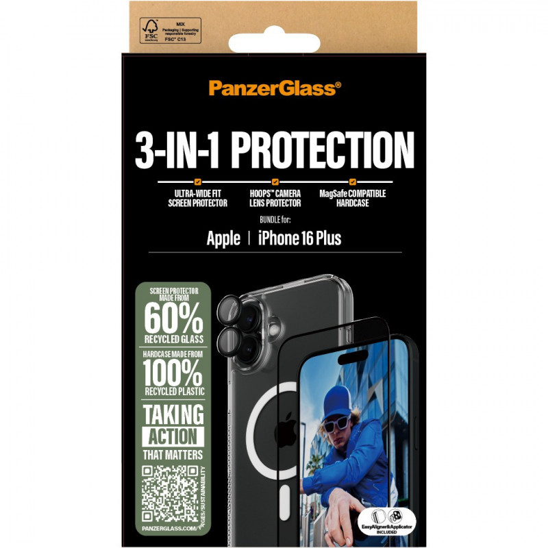 "PanzerGlass ® 3-in-1 Protection Bundle iPhone 16 Plus. Brand compatibility: Apple, Compatibility: Apple - iPhone 16 Plus. Dry application. Protection features: Scratch resistant, Shock resistant. Material: Tempered glass, Polyethylene terephthalate (PET), Silicone, Product colour: Transparent. Quantity per pack: 1 pc(s)"\n"Want to protect your phone? I mean REALLY protect your phone? Then this 3-in-1 protection pack from PanzerGlass® is for you! Featuring a MagSafe compatible HardCase, an Ultra-Wide Fit Screen Protector, and HoopsTMCamera Lens Protector, this pack shields your phone from scratch-creating bumps against sharp-edged corners, phone-cracking falls onto stone-hard pavements and just about anything else life might throw at you. The screen protector even has a smudge-free coating that reduces traces of fingerprints and grease.