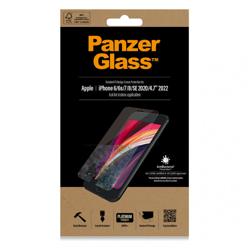 "PanzerGlass ® Screen Protector iPhone 8 | 7 | 6s | 6 | SE (2020/2022) | Standard Fit. Brand compatibility: Apple, Compatibility: Apple - iPhone 6s, Apple - iPhone 7, Apple - iPhone 8, Apple - iPhone SE 2020, Apple - iPhone SE.... Dry application. Protection features: Scratch resistant, Shock resistant, Anti-bacterial. Material: Tempered glass, Polyethylene terephthalate (PET), Silicone, Product colour: Transparent. Quantity per pack: 1 pc(s)"\n"Protect your phone from the hazards of everyday life with PanzerGlass®. Accidental bumps against sharp-edged dangers in your pocket or crushing falls onto stone-hard pavements are no match for this scratch and shock-resistant screen protector. It even has a smudge-free coating with antibacterial effect that reduces traces of fingerprints and kills up to 99.99% of all common surface bacteria. The screen protector is easy to apply and once installed, you’ll never again fear the sight of your phone tumbling to the ground. This may never happen, but if it does, you’ll regret not having clicked “add to cart”.