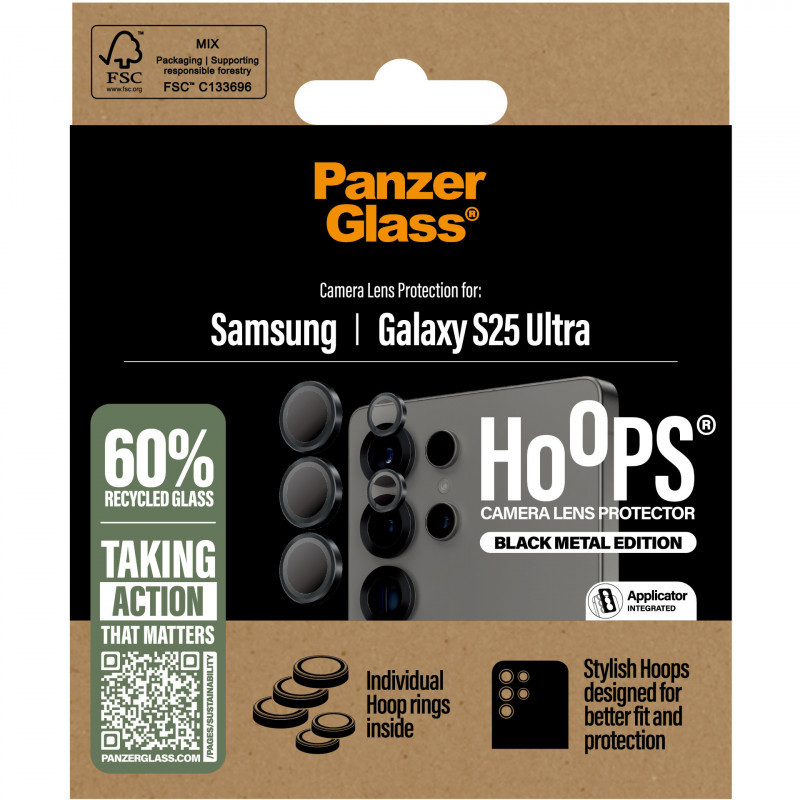 "PanzerGlass ® Hoops® Camera Lens Protector Black Samsung Galaxy S25 Ultra. Brand compatibility: Samsung, Compatibility: Samsung - Galaxy S25 Ultra. Dry application. Protection features: Scratch resistant, Shock resistant. Material: Tempered glass, Silicone, Product colour: Black. Quantity per pack: 1 pc(s)"\n"No “Oops!” with Hoops®! The PanzerGlass® Hoops® camera lens protector shields your camera lenses from scratch-creating bumps, drops on stone-hard floors, and the screeching kiss of keys in your pocket. The slim profile optic rings are equipped with scratch-and shock-resistant glass and a black aluminum frame that protect your lenses as well as looking great. And if you’re worried about image distortion, rest easy: Hoops® don’t affect the clarity of your lenses or the quality of your photos – they just give you a bit more peace of mind. Hoops® protect and prolong the lifetime of your phone so that one day you can pass it on to someone else who will love it just as much as you do. It’s the new circle of phone life. By extending the lifespan of our devices, we postpone the need to produce new devices. This is one way of working toward a more sustainable future. Another is to use less packaging: In 2024, we reduced the amount of paper in our PanzerGlass® core product packaging design by an average of 66 %*. So, of course, this product comes in a recyclable FSC™-certified box. The optic rings are designed for easy application and perfect fit. They are equipped with a silicone adhesive along the edges and come with an easy-to-use applicator that makes installation a piece of cake (seriously!). And remember: Once installed, you’ll never again fear your phone falling camera-first. This might not happen, but then again … it might! *Reduction from 2022-2024 measured by comparing selected products from the PanzerGlass® core range."