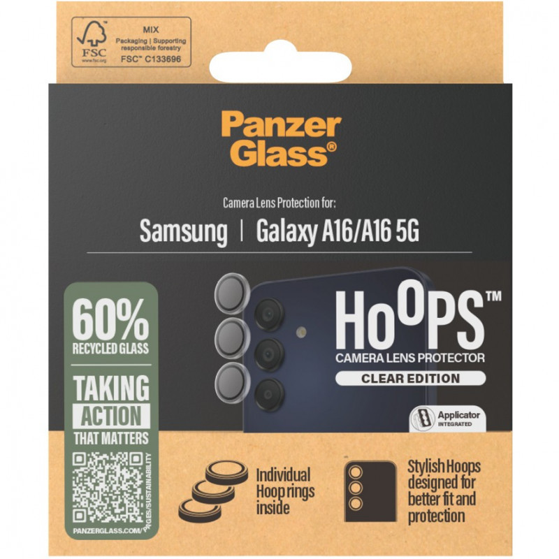 "PanzerGlass ® Hoops® Camera Lens Protector Transparent Samsung Galaxy A16 | A16 5G. Brand compatibility: Samsung, Compatibility: Samsung - Galaxy A16 4G, Samsung - Galaxy A16 5G. Dry application. Protection features: Scratch resistant, Shock resistant. Material: Tempered glass, Silicone, Product colour: Transparent. Quantity per pack: 1 pc(s)"\n"No ”Oops!” with Hoops®! The PanzerGlass® Hoops® Camera Lens Protector keeps your camera lenses safe from accidental drops on stone-hard floors, bumps against sharp corners, and the screeching kiss of keys in your pocket. These Hoops® feature a clear frame that allow your phone's color to shine through, enhancing its natural look. The slim profile optic rings are equipped with scratch-and shock-resistant glass and a metal frame that protect your lenses as well as looking great. And if you’re worried about image distortion, you can rest easy: Hoops® don’t affect the clarity of your lenses or the quality of your photos – they just give you a bit more peace of mind.