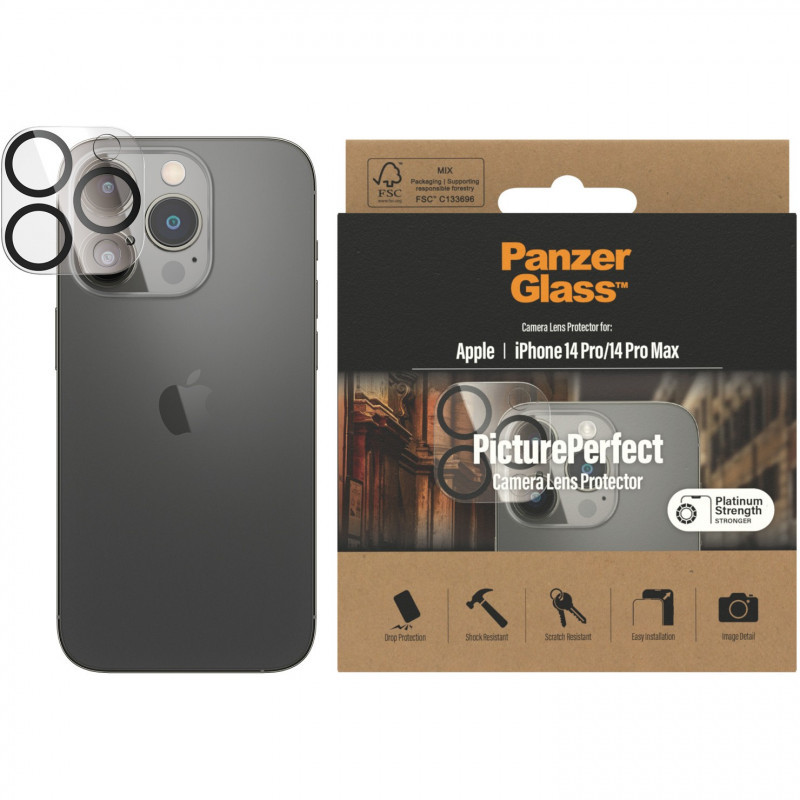 "PanzerGlass ® PicturePerfect Camera Lens Protector iPhone 14 Pro | 14 Pro Max. Brand compatibility: Apple, Compatibility: Apple - iPhone 14 Pro, Apple - iPhone 14 Pro Max. Dry application. Protection features: Scratch resistant, Shock resistant. Material: Tempered glass, Silicone, Product colour: Transparent. Quantity per pack: 1 pc(s)"\n"The latest smartphones feature increasingly powerful camera systems. However, all this advanced technology amounts to nothing if you scratch or crack your lenses, leaving you with a permanent scar on future photos. With the PanzerGlass® PicturePerfect Camera Lens Protector, your camera lenses are safe from accidental drops on stone-hard floors, bumps against sharp corners and the screeching kiss of keys in your pocket. And if you’re worried about image distortion, you can rest easy: the camera lens protector doesn’t affect the clarity of your lenses nor the quality of your photos – it just gives you a bit more peace of mind. The PicturePerfect Camera Lens Protector is designed with a commitment to extend the lifetime of your device and comes in FSC™-certified packaging that can be recycled."