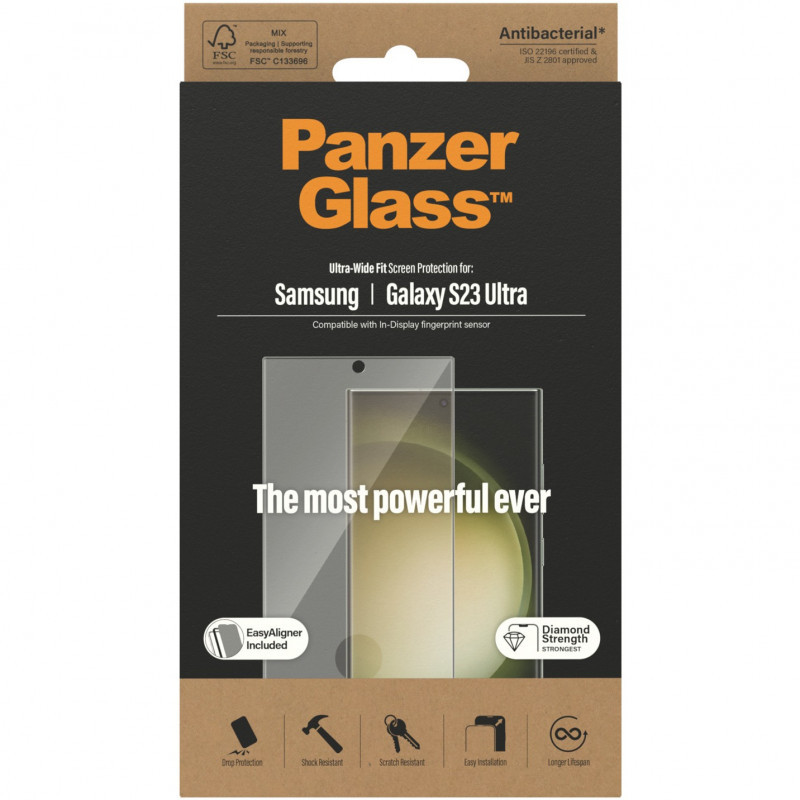 "PanzerGlass ® Screen Protector Samsung Galaxy S23 Ultra | Ultra-Wide Fit w. EasyAligner. Brand compatibility: Samsung, Compatibility: Samsung - Galaxy S23 Ultra. Dry application. Protection features: Scratch resistant, Shock resistant, Anti-bacterial. Material: Tempered glass, Polyethylene terephthalate (PET), Silicone, Product colour: Transparent. Quantity per pack: 1 pc(s)"\n"Protect your Samsung from the hazards of everyday life with a PanzerGlass® screen protector. Accidental bumps against sharp-edged dangers in your pocket or crushing falls onto stone-hard pavements are no match for this scratch and shock-resistant screen protector, which provides high-level drop protection. It even has a smudge-free coating with antibacterial effect that reduces traces of fingerprints and kills up to 99.99% of all common surface bacteria. And if you’re worried about fingerprint readability, you can rest easy: The touch circle – which you can see on top of the ultrasonic fingerprint reader – provides 100% fingerprint recognition, so your phone unlocks smoothly every time.