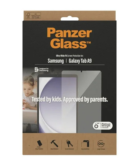 PanzerGlass skirtas Samsung Galaxy Tab A9 su Ultra-Wide Fit (UWF) dizainu – tai grūdintas apsauginis stiklas, pilnai padengiantis planšetės priekinį skydelį net iki kraštų. Apsauga yra atspari įbrėžimams ir smūgiams, todėl gali padėti apsaugoti ekraną nuo kasdienių pažeidimų.