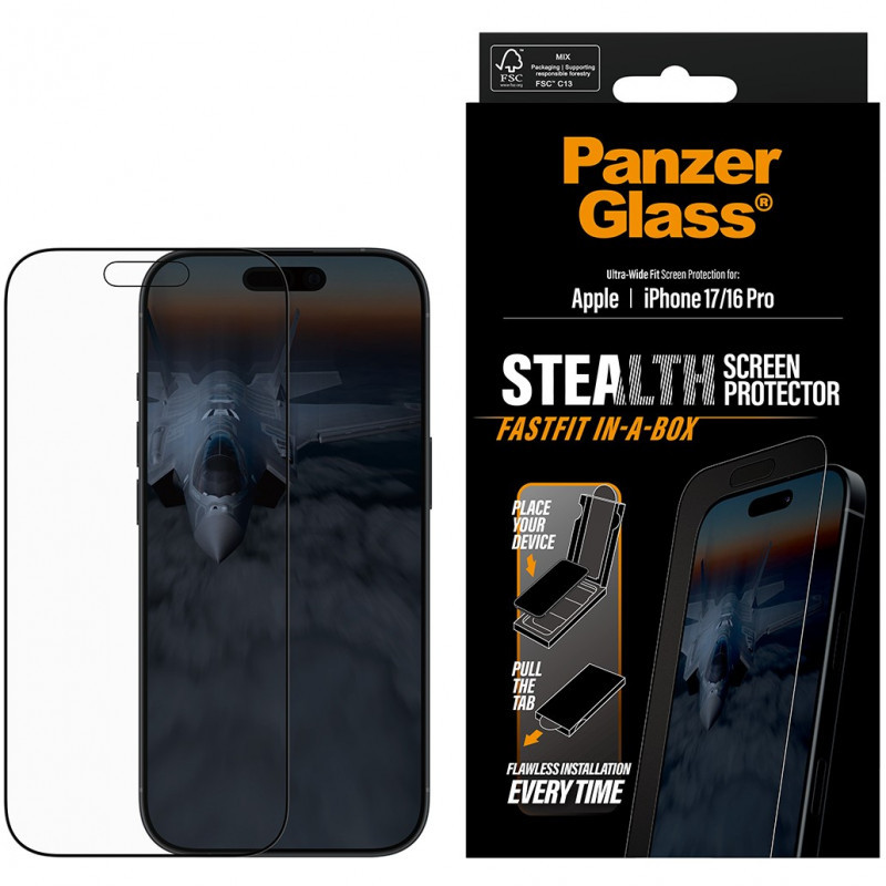 "PanzerGlass ® Stealth Screen Protector iPhone 17 | iPhone 16 Pro | Ultra-Wide Fit w. FASTFIT IN-A-BOX. Brand compatibility: Apple, Compatibility: Apple - iPhone 17, Apple - iPhone 16 Pro. Dry application. Protection features: Scratch resistant, Shock resistant. Material: Tempered glass, Polyethylene terephthalate (PET), Silicone, Product colour: Transparent. Quantity per pack: 1 pc(s)"\n"FLAWLESS INSTALLATION EVERY TIME. Installation has never been easier with the new FASTFIT IN-A-BOX system. Say goodbye to alignment issues and dust intrusion. Simply place your phone face-up, pull the tab, and enjoy a flawless installation every time.