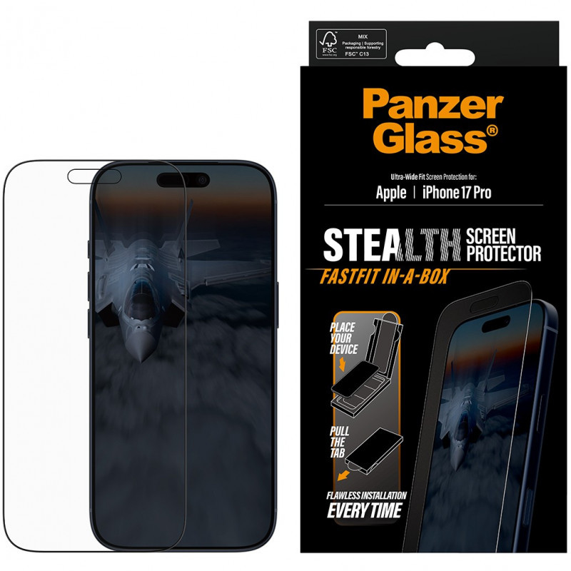 "PanzerGlass ® Stealth Screen Protector iPhone 17 Pro | Ultra-Wide Fit w. FASTFIT IN-A-BOX. Brand compatibility: Apple, Compatibility: Apple - iPhone 17 Pro. Dry application. Protection features: Scratch resistant, Shock resistant. Material: Tempered glass, Polyethylene terephthalate (PET), Silicone, Product colour: Transparent. Quantity per pack: 1 pc(s)"\n"FLAWLESS INSTALLATION EVERY TIME. Installation has never been easier with the new FASTFIT IN-A-BOX system. Say goodbye to alignment issues and dust intrusion. Simply place your phone face-up, pull the tab, and enjoy a flawless installation every time.