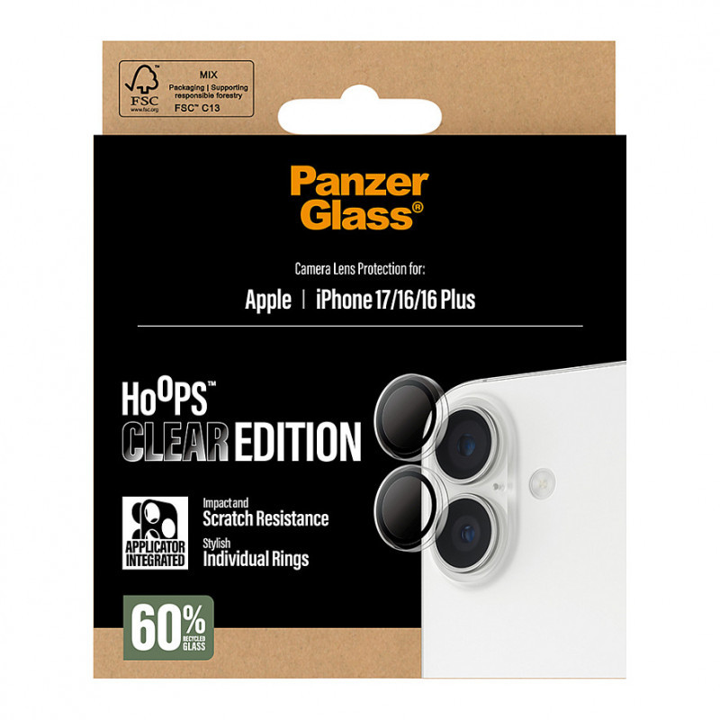 "PanzerGlass ® Hoops® Camera Lens Protector Transparent iPhone 17 | iPhone 16 | 16 Plus. Brand compatibility: Apple, Compatibility: Apple - iPhone 17, Apple - iPhone 16, Apple - iPhone 16 Plus. Dry application. Protection features: Scratch resistant, Shock resistant. Material: Tempered glass, Silicone, Product colour: Transparent. Quantity per pack: 1 pc(s)"\n"No ”Oops!” with Hoops! The PanzerGlass® Hoops Camera Lens Protector keeps your camera lenses safe from accidental drops on stone-hard floors, bumps against sharp corners, and the screeching kiss of keys in your pocket. The slim profile optic rings are equipped with scratch-and shock-resistant glass and a metal frame that protect your lenses as well as looking great. And if you’re worried about image distortion, you can rest easy: Hoops don’t affect the clarity of your lenses or the quality of your photos – they just give you a bit more peace of mind. The optic rings are designed for easy application and perfect fit. They are equipped with a silicone adhesive along the edges and come with an easy-to-use applicator that makes installation so simple that most people can do it on the first try! And remember: Once Hoops are installed, you’ll never again fear the sight of your phone tumbling to the ground camera first. This may not happen, but if it does, you’ll regret not having clicked “add to cart”. Hoops protect and prolong the lifetime of your phone so that one day you can pass it on to someone else who will love it just as much as you do. It’s the new circle of phone life. By extending the lifespan of our devices, we postpone the need to produce new devices. This is one way of working toward a more sustainable future. And to top it all off, Hoops – of course, comes in a recyclable FSC™-certified box."