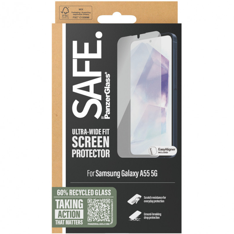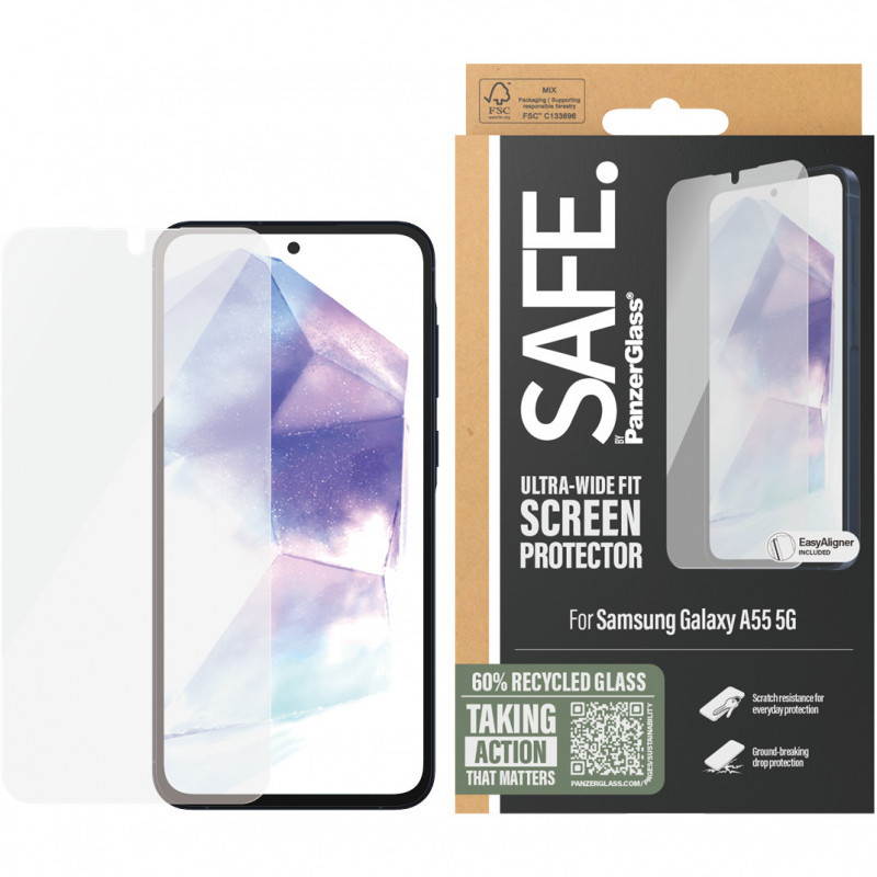 "PanzerGlass SAFE. by ® Screen Protector Samsung Galaxy A55 5G | Ultra-Wide Fit w. EasyAligner. Brand compatibility: Samsung, Compatibility: Samsung - Galaxy A55 5G. Dry application. Protection features: Scratch resistant, Shock resistant. Material: Tempered glass, Polyethylene terephthalate (PET), Silicone, Product colour: Transparent. Quantity per pack: 1 pc(s)"\n"SAFE. is for real. SAFE. is for you. SAFE. is for dance floor mishaps, selfies gone wrong and your everyday fumbling, dropping and screen cracking. This SAFE. by PanzerGlass®️ screen protector made of 60% recycled material acts as a discrete airbag, protecting your phone by absorbing impacts and providing high-level scratch resistance without compromising the functionality and look of your device. It even has a smudge-free coating that reduces traces of fingerprints and grease and ensures 100% compatibility with your screen’s ultrasonic fingerprint reader.