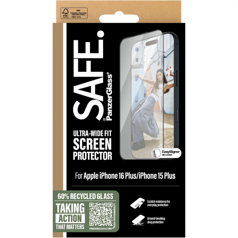 "PanzerGlass SAFE. by ® Screen Protection w. Black Frame iPhone 16 Plus | 15 Plus | Ultra-Wide Fit. Brand compatibility: Apple, Compatibility: Apple - iPhone 16 Plus, Apple - iPhone 15 Plus. Dry application. Protection features: Scratch resistant, Shock resistant. Material: Tempered glass, Polyethylene terephthalate (PET), Silicone, Product colour: Transparent. Quantity per pack: 1 pc(s)"\n"SAFE. is for real. SAFE. is for you. SAFE. is for dance floor mishaps, selfies gone wrong and your everyday fumbling, dropping and screen cracking. This SAFE. by PanzerGlass® screen protector made of 60% recycled material acts as a discrete airbag, protecting your phone by absorbing impacts and providing high-level scratch resistance without compromising the functionality and look of your device. It even has a smudge-free coating that reduces traces of fingerprints and grease and ensures 100% compatibility with your screen’s ultrasonic fingerprint reader. Can you feel it? Love is in the air. Love for phones and the planet. It’s the new circle of phone life. When you keep your beloved phone SAFE., you can one day pass it on to another phone lover who will love it just as much as you do. Choose SAFE. and give your phone a second, third or fourth life! This is one way of working toward a more sustainable future! Another is to use more sustainable packaging. So, of course, this product comes in a recyclable FSC™-certified box. Everybody deserves to be SAFE. Without hassle, red tape, or unnecessary complexity. This screen protector comes with an EasyAligner that makes installation a piece of cake (seriously!) and to make it even easier, we’ve included step-by-step instructions as well as a QR code for quick access to our online how-to video. And remember: You just need to install the screen protection once! Then you’ll never again fear the sight of your phone tumbling to the ground screen first. This may not happen, but if it does, you’ll regret not having clicked “add to cart”. No screen protection is worth poor screen performance! That’s why this screen protector comes in Ultra-Wide Fit, meaning it covers the front surface of your phone, providing a complete and crystal-clear view of your screen. It even leaves a little room around the edges for a case from CARE by PanzerGlass®. And if you want to be extra SAFE., combine the screen protector and case with a SAFE. by PanzerGlass® camera lens protector. Keep your phone SAFE."