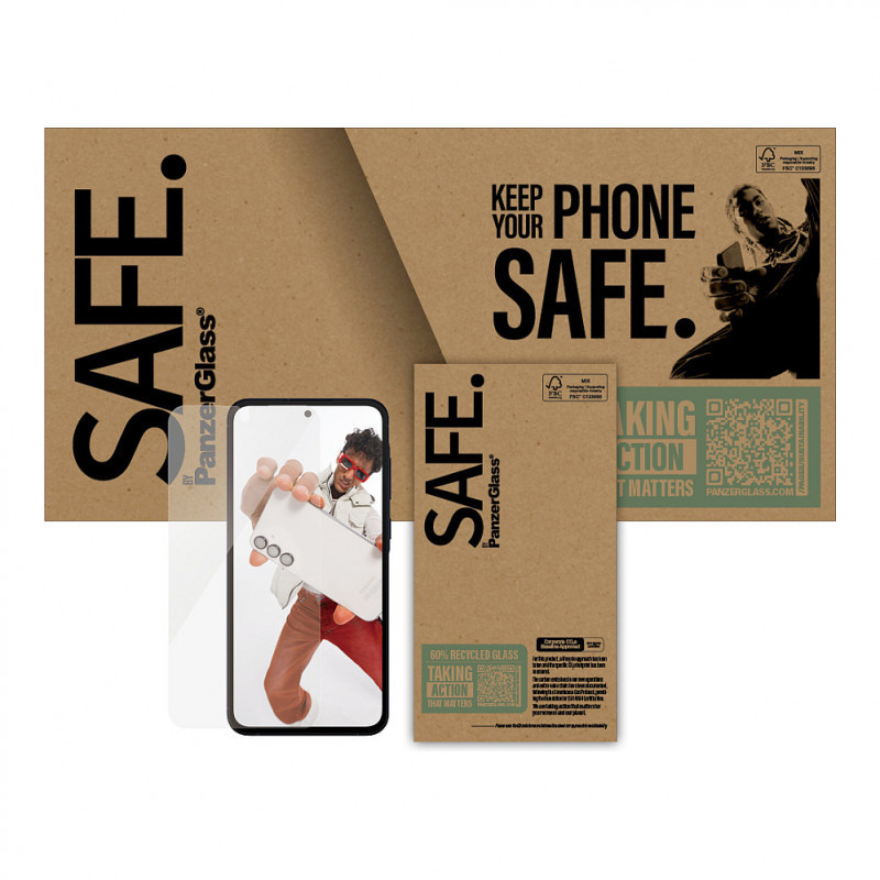 "PanzerGlass SAFE. by ® Screen Protector Galaxy S24 FE | A36 5G | A56 5G | Ultra-Wide Fit | BULK. Brand compatibility: Samsung, Compatibility: Samsung - Galaxy A36 5G, Samsung - Galaxy A56 5G, Samsung - Galaxy S24 FE 5G. Dry application. Protection features: Scratch resistant, Shock resistant. Material: Tempered glass, Polyethylene terephthalate (PET), Silicone, Product colour: Transparent. Quantity per pack: 50 pc(s)"\n"Keep your phone safe from dance floor mishaps, selfies gone wrong and your everyday fumbling, dropping and screen cracking with an original screen protector from SAFE. by PanzerGlass®️. The tempered glass acts as a discrete airbag, protecting your phone by absorbing impact and providing a high level of scratch protection without compromising the functionality and look of your device.