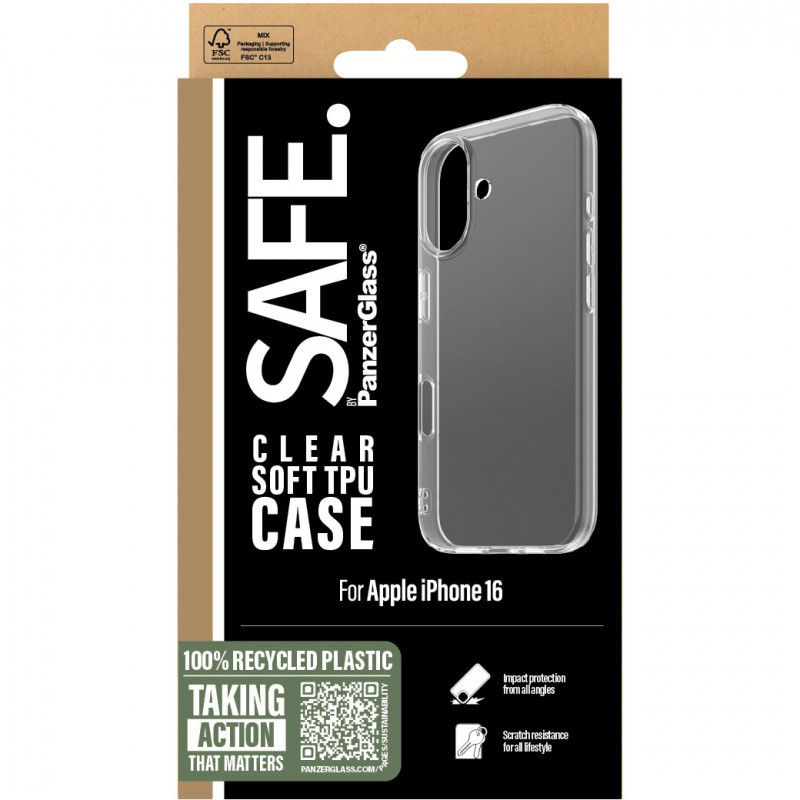 "PanzerGlass SAFE. by ® TPU Case Transparent iPhone 16. Case type: Cover, Brand compatibility: Apple, Compatibility: Apple - iPhone 16, Product colour: Transparent"\n"Protect your phone from pocket plunges, backseat bumps and freaky Friday-night falls with the Soft TPU Case from SAFE. by PanzerGlass®. The thin, sleek and transparent case is made of 100% recycled plastic and shields your phone effectively while giving you full access to all of its functions. It is wireless charging compatible and anti-yellowing, ensuring that your case will continue to look good, day after day – even when exposed to sunlight and beach parties. The Soft TPU Case protects and prolongs the lifetime of your phone so that one day you can pass it on to someone else who will love it just as much as you do. This is one way of working toward a more sustainable future. Another is to use more sustainable packaging. So, of course, this product comes in a recyclable FSC™-certified box. Installation is easy. Just click on the case and you can breathe freely, knowing that you’ll never again fear the terrifying sight of your phone tumbling to the ground. This may not happen, but if it does, you’ll regret not having clicked “add to cart”. And remember: If you want to take extra good care of your phone, you can combine the case with a screen protector and a camera lens protector from SAFE. by PanzerGlass®. Keep your phone SAFE."