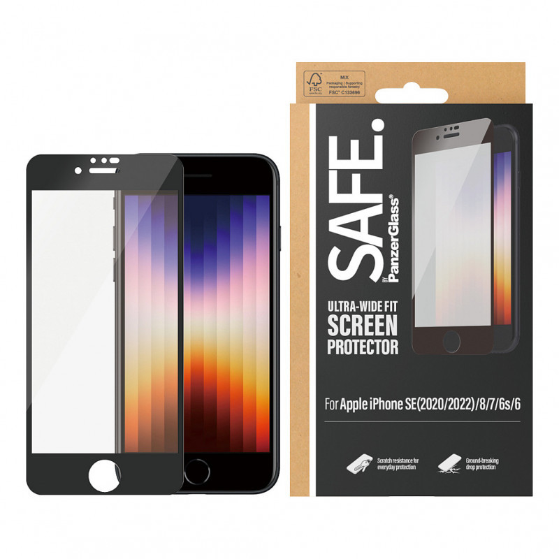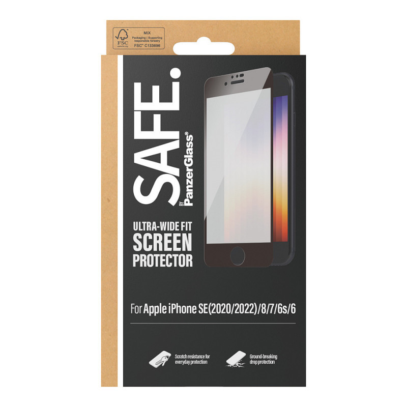 "PanzerGlass SAFE. by ® Screen Protector iPhone 8 | 7 | 6 | 6s | SE (2020/2022) | Edge-to-Edge. Brand compatibility: Apple, Compatibility: Apple - iPhone 6, Apple - iPhone 6s, Apple - iPhone 7, Apple - iPhone 8, Apple - iPhone SE 2020,.... Dry application. Protection features: Scratch resistant, Shock resistant. Material: Tempered glass, Polyethylene terephthalate (PET), Silicone, Product colour: Transparent. Quantity per pack: 1 pc(s)"\n"Keep your phone safe from dance floor mishaps, selfies gone wrong and your everyday fumbling, dropping and screen cracking with an original screen protector from SAFE. by PanzerGlass®️. The tempered glass acts as a discrete airbag, protecting your phone by absorbing impact and providing a high level of scratch protection without compromising the functionality and look of your device. The edge-to-edge case-friendly fit offers full screen coverage and is designed to work with most cases."