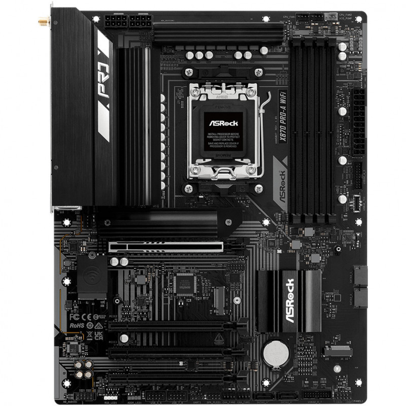"Asrock X870 Pro-A WiFi. Processor manufacturer: AMD, Processor socket: Socket AM5, Compatible processor series: AMD Ryzen 6000 Series, AMD Ryzen 7000 Series, AMD Ryzen 8000 Series, AMD Ryzen 9000 Series, AMD.... Supported memory types: DDR5-SDRAM, Maximum internal memory: 256 GB, Memory slots type: DIMM. Supported storage drive interfaces: M.2, SATA III, RAID levels: 0, 1, 10. Ethernet interface type: 2.5 Gigabit Ethernet, LAN controller: Dragon RTL8125BG, Top Wi-Fi standard: Wi-Fi 7 (802.11be). Component for: PC, Motherboard form factor: ATX, Motherboard chipset family: AMD"\n"16+2+1 Power Phase Design