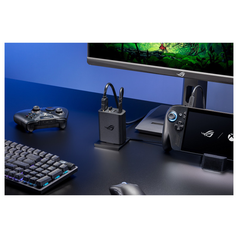 Charge, display, and expand your device's functionality with the ROG 100W Gaming Charger Dock. With up to 100W of power delivery, you can keep your laptop, smartphone, or handheld fully powered while connected to a larger screen via HDMI 2.0. Connect to a TV and enjoy couch play at 4K 60Hz or 1080p 120Hz with a controller, or connect to a monitor and plug a keyboard and mouse into the dual USB-A ports for the full battlestation experience.
