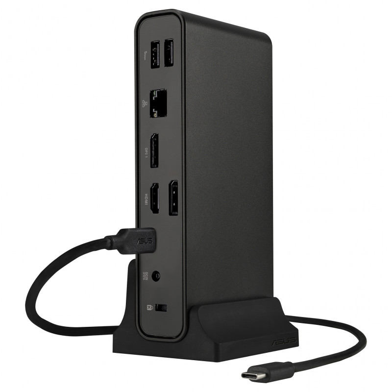 "ASUS Triple Display USB-C Dock Duo DC301. Connectivity technology: Wired, USB Power Delivery up to: 90 W. Ethernet LAN data rates: 1000 Mbit/s. Product colour: Black, Compatible memory cards: SD, Data transfer rate: 10 Gbit/s. Power source type: DC, Input current: 7.5 A, Power supply: 150 W. Width: 160 mm, Depth: 80 mm, Height: 32 mm"\n"Compact productivity magic
