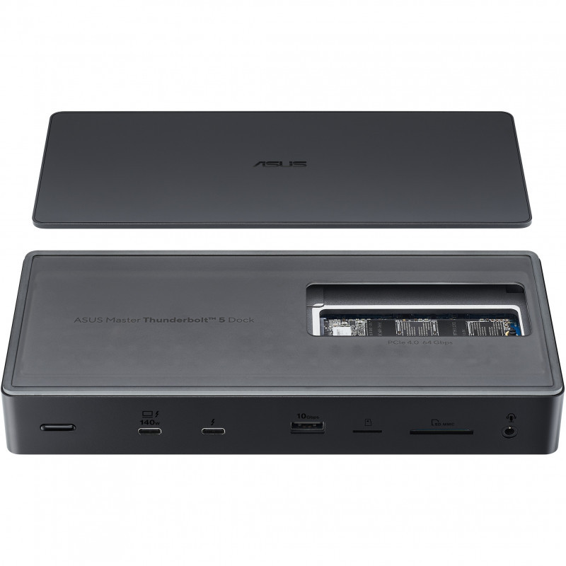 "ASUS Master Thunderbolt 5 Dock DC510. Connectivity technology: Wired, Host interface: Thunderbolt 5, USB Power Delivery up to: 140 W. Ethernet LAN data rates: 2500 Mbit/s. Product colour: Black, Compatible memory cards: MicroSD (TransFlash), SD, Supported storage drive types: SSD. Power source type: DC, Input current: 9 A, Power cable length: 1 m. Width: 220 mm, Depth: 96.7 mm, Height: 38.1 mm"\n"Unleash lightning-fast potential