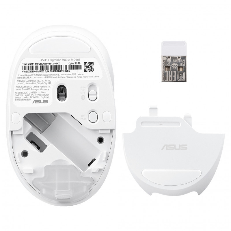 "ASUS Fragrance Mouse MD101. Form factor: Ambidextrous. Movement detection technology: Optical, Device interface: RF Wireless + Bluetooth, Movement resolution: 2400 DPI, Buttons type: Pressed buttons, Buttons quantity: 3, Scroll type: Wheel. Power source: Batteries. Product colour: White"\n"Scent your space, perfect your pace