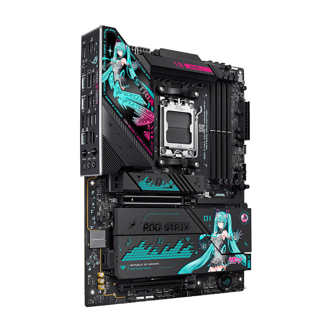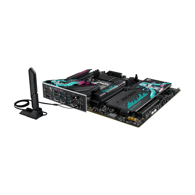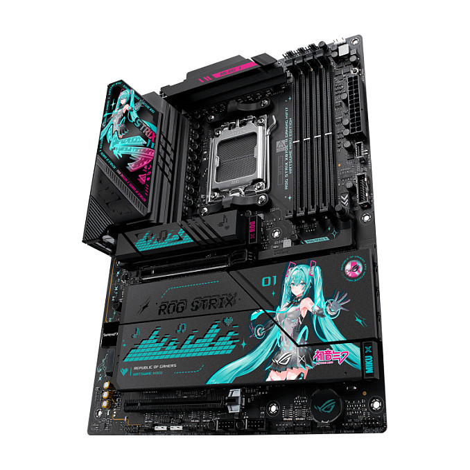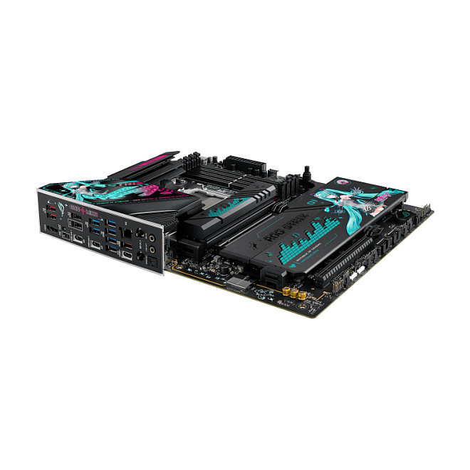 "ASUS ROG STRIX X870E-H GAMING WIFI7 HATSUNE MIKU EDITION. Processor manufacturer: AMD, Processor socket: Socket AM5, Compatible processor series: AMD Ryzen 7000 Series, AMD Ryzen 8000 Series, AMD Ryzen 9000 Series. Supported memory types: DDR5-SDRAM, Maximum internal memory: 256 GB, Memory channels: Dual-channel. Supported storage drive interfaces: M.2, SATA III, Supported storage drive types: HDD & SSD, RAID levels: 0, 1, 5, 10. Ethernet interface type: 5 Gigabit Ethernet, Top Wi-Fi standard: Wi-Fi 7 (802.11be), Wi-Fi standards: Wi-Fi 7 (802.11be). Component for: PC, Motherboard form factor: ATX, Motherboard chipset family: AMD"\n"Feel the Beat,