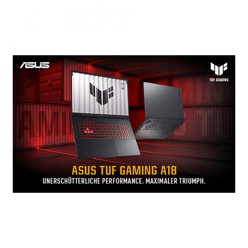 "ASUS TUF Gaming A18 FA808UP-S8022W. Product type: Laptop, Form factor: Clamshell. Processor family: AMD Ryzen™ 7, Processor model: 260, Processor frequency: 3.8 GHz. Display diagonal: 45.7 cm (18""), HD type: WUXGA, Display resolution: 1920 x 1200 pixels. Internal memory: 32 GB, Internal memory type: DDR5-SDRAM. Total storage capacity: 1 TB, Storage media: SSD. On-board graphics card model: AMD Radeon 780M. Operating system installed: Windows 11 Home. Product colour: Grey"\n"Robust Performance, Elevated Victory.