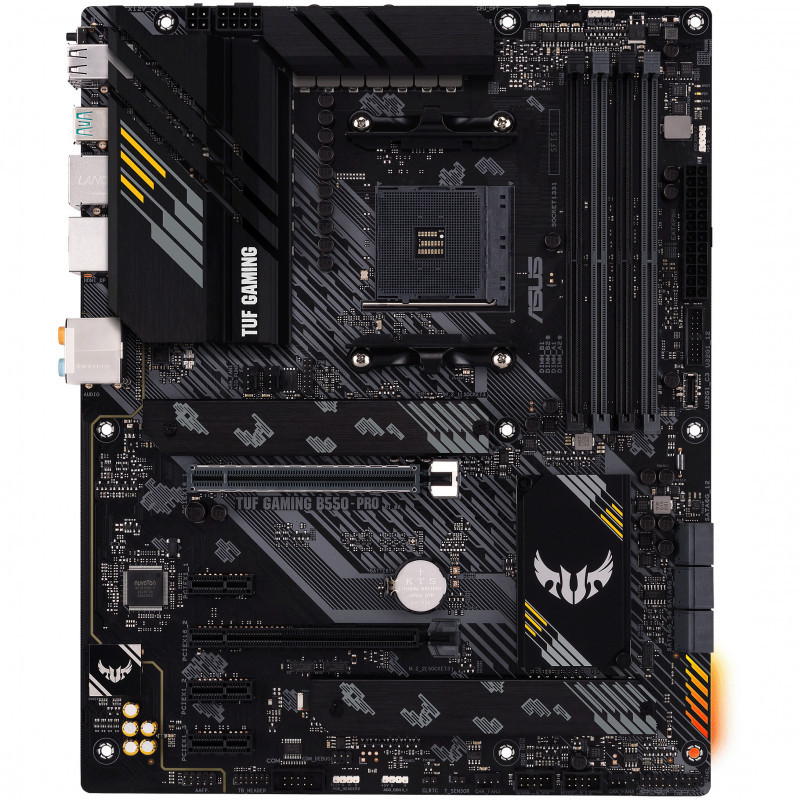 TUF Gaming B550-PRO provides a complete, high-performance gaming package with a long list of features to improve your experience, including ultrafast networking for smoother online gameplay, pristine audio with positional cues for FPS gaming, and onboard RGB lighting that syncs with attached accessories to help you create a personalized gaming atmosphere.
