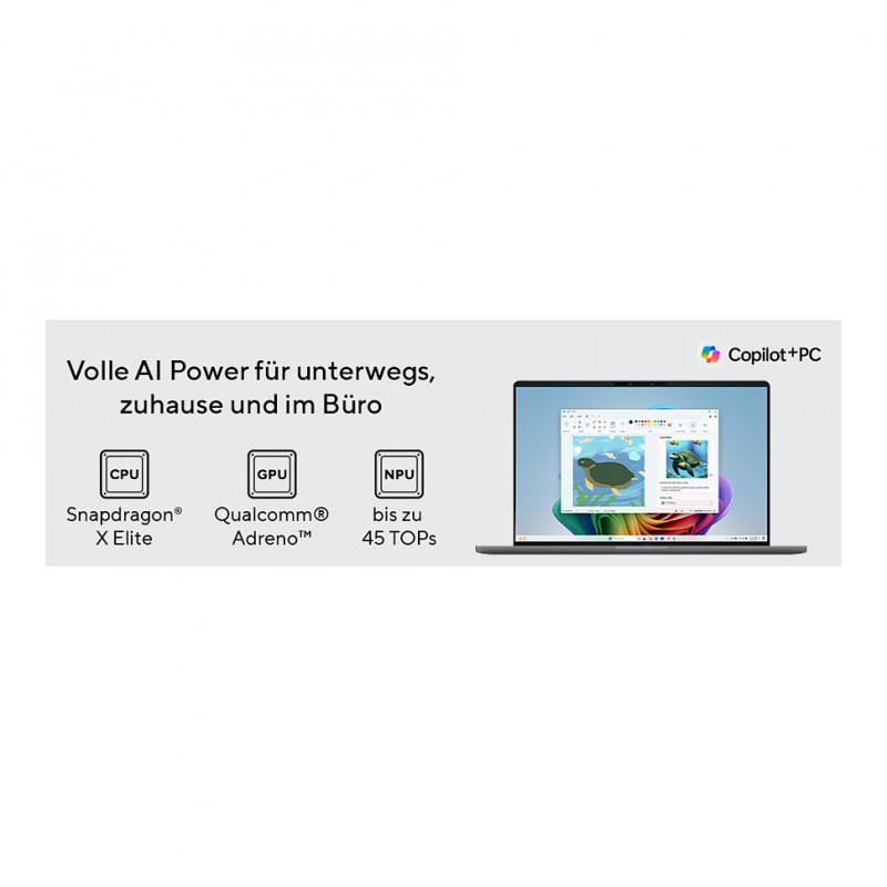 Get bigger things done with a lighter design! At just under a kilogram1, Zenbook A14 is born to go places. Its Snapdragon® X Series processor unleashes the full benefits of Copilot+, and empowers your lifestyle with multi-working-day battery life.